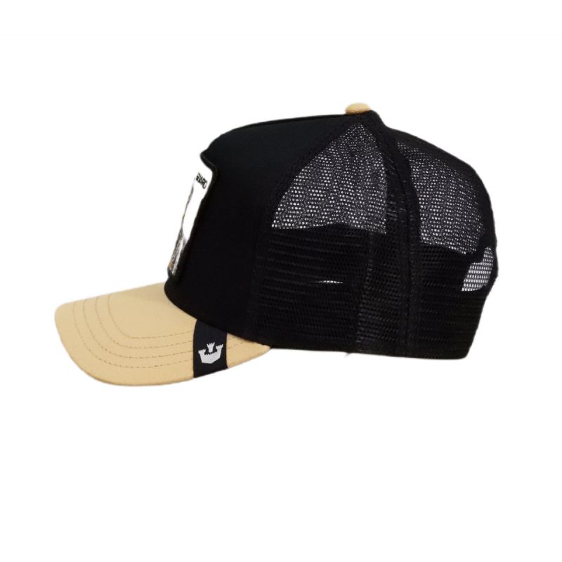 Schwarze und beige Truckerkappe mit einem Goorin Bros Jacquard-Etikett auf dem Schirm.