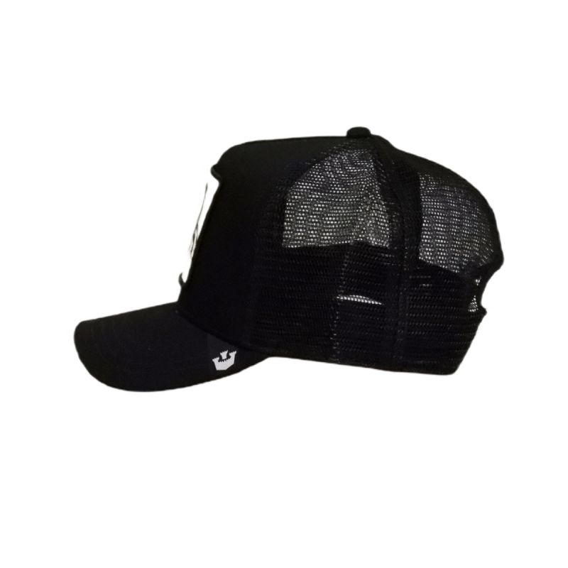Schwarze Truckerkappe mit Goorin Bros Jacquard-Etikett auf dem Schirm.