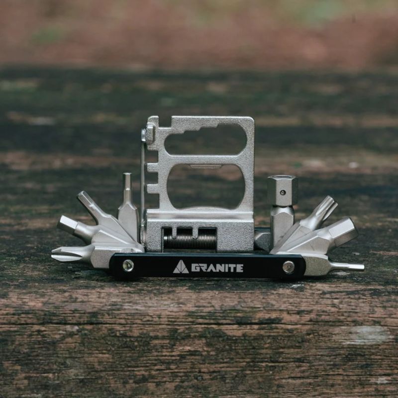 Das Granite Diverse 20 vereint maximale Funktionalität in einem beeindruckend schlanken Design – nur 11 mm dick. Mit einem Gewicht von nur 104 g ist dieses ultrakompakte Multitool ideal für Radfahrer, die vielseitige Einsatzmöglichkeiten ohne unnötiges Gewicht wünschen. Mit 20 essentiellen Funktionen – darunter Inbus-Bits (2 bis 8 mm), ein T25-Bit, ein PH2-Schraubendreher, ein Kettennieter und -haken, Speichenschlüssel, Steckschlüssel und sogar ein Flaschenöffner – ist es die Komplettlösung für Reparaturen unterwegs und Justierungen auf dem Trail.