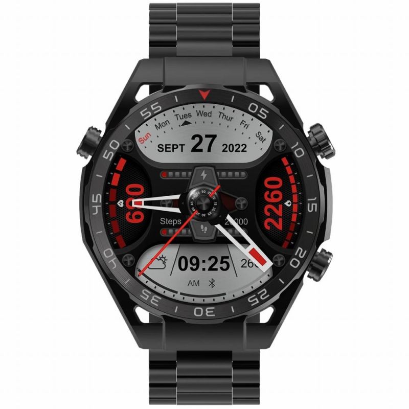 Stilvoll, funktional, innovativ. Robustes Metallgehäuse, Mineral- und gehärtetes Glas, 1,39-Zoll-Touchscreen mit einer Auflösung von 360 x 360 Pixeln, Anruffunktion, Musikplayer-Steuerung, zahlreiche Sportmodi, leistungsstarker Akku.