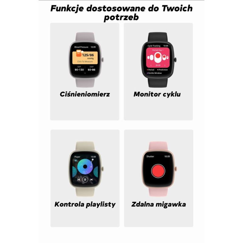 Das 1,83 Zoll große TFT-Display (240 × 284 Pixel) ist gestochen scharf – klar, berührungsempfindlich und reaktionsschnell. Hinzu kommen die Personalisierung des Zifferblatts, animierte Grafiken und ein Menü in Polnisch – alles, was Sie brauchen, um Ihre Uhr perfekt an Ihren Stil, Ihre Stimmung und den jeweiligen Anlass anzupassen.