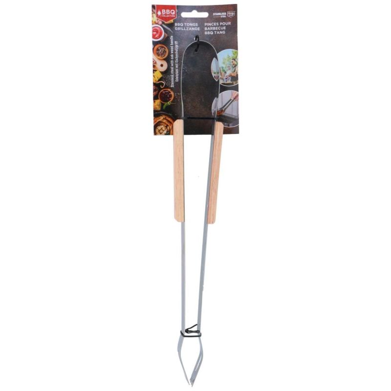 Die Grillzange hat lange Griffe mit Holzgriffen, die es ermöglichen, einen sicheren Abstand zum heißen Grill zu halten und sich vor möglichen Verbrennungen zu schützen.