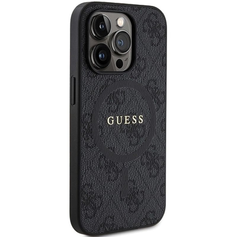 Guess 4G Collection MagSafe-Hülle aus Leder und Metalllogo für iPhone 14 Pro Max – Schwarz