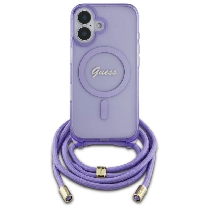 Guess Crossbody Cord Script MagSafe Hülle für iPhone 16 – Lila