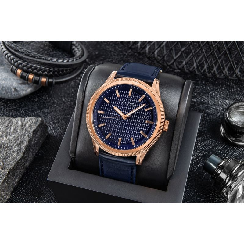 Die Herrenuhr Guess Dex GW0846G2 besticht durch ein elegantes Armband aus hochwertigem, tiefblauem Echtleder. Die dezente Textur und die angenehme Weichheit sorgen für perfekten Sitz am Handgelenk und ganztägigen Tragekomfort. Das Lederarmband unterstreicht nicht nur den luxuriösen Charakter der Uhr, sondern verleiht ihr auch eine stilvolle Note und macht sie so zum idealen Begleiter sowohl beim Anzug als auch in der Freizeit. Der marineblaue Farbton des Armbands harmoniert perfekt mit dem roségoldfarbenen Gehäuse und dem marineblauen Zifferblatt und erzeugt so einen ausdrucksstarken Look. Eine robuste Schließe gewährleistet sicheren Halt, während das strapazierfähige Leder Langlebigkeit und zeitlosen Stil garantiert.
