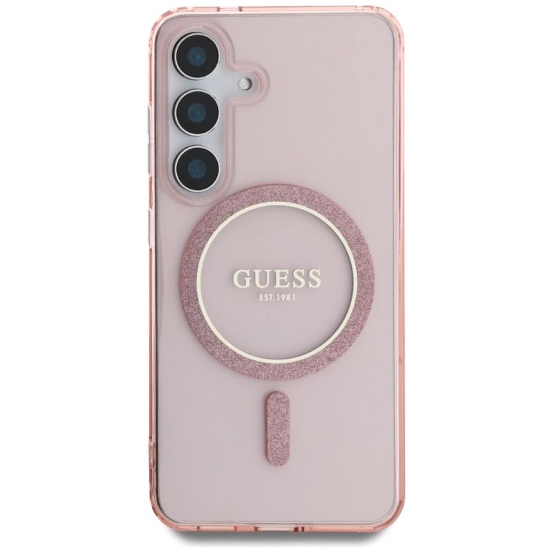 Guess Glitter Circle Classic Logo MagSafe Hülle für Samsung Galaxy S25 rosa