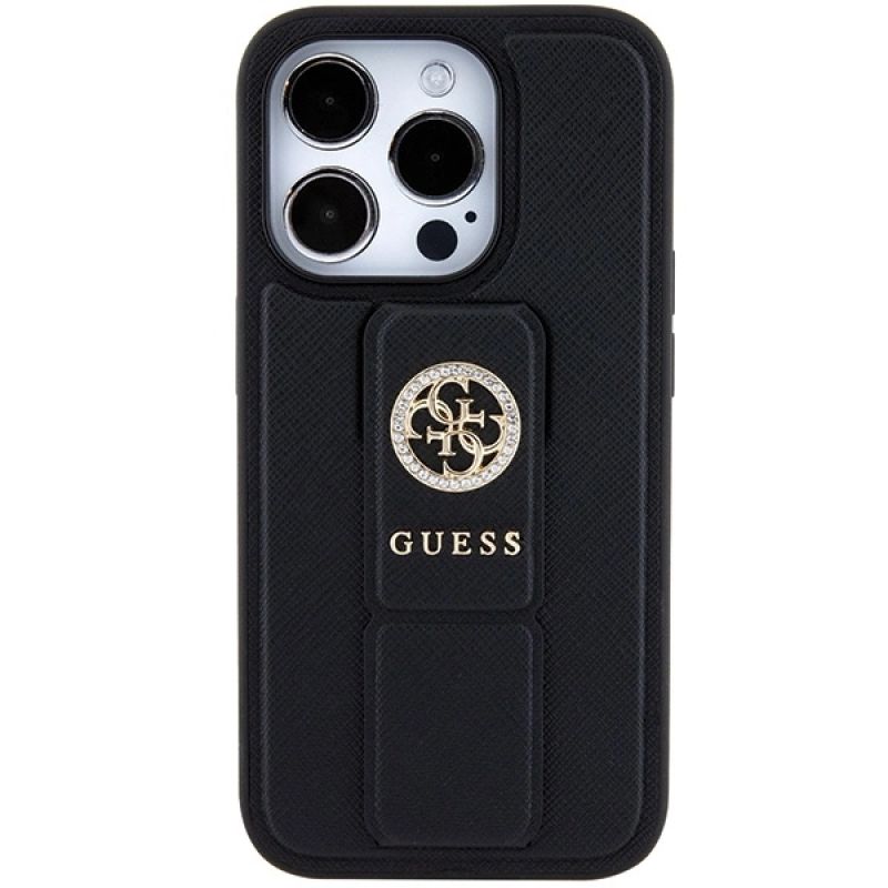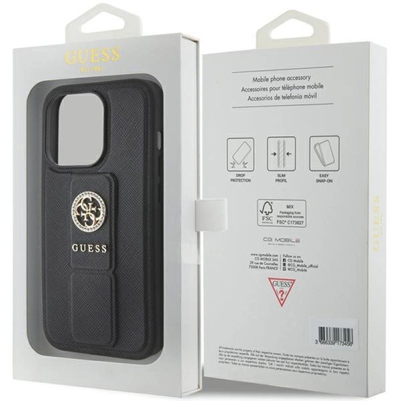 Guess Grip Stand 4G Saffiano Strass Hülle für iPhone 15 Pro Max - Schwarz