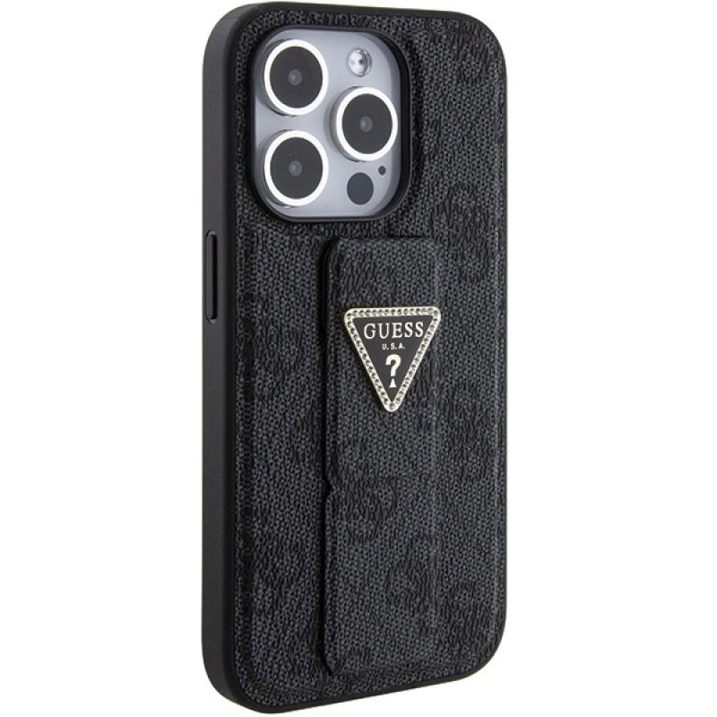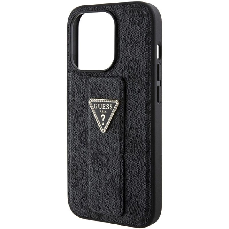 Guess Grip Stand 4G Triangle Strass Hülle für iPhone 15 Pro Max - Schwarz