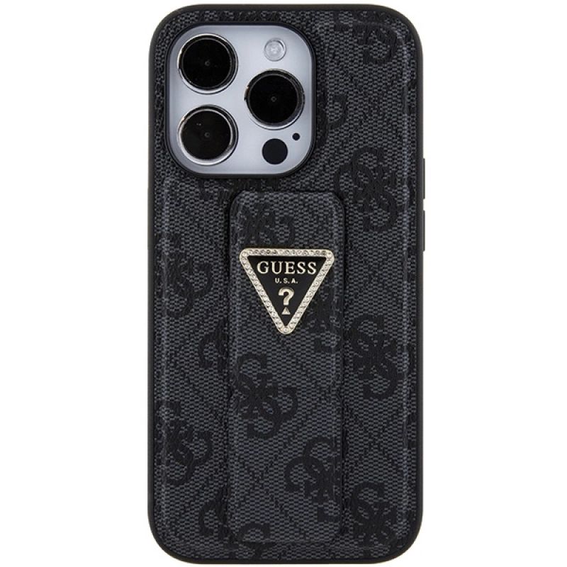 Guess Grip Stand 4G Triangle Strass Hülle für iPhone 15 Pro – Schwarz