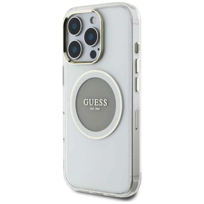 Sammlung Guess IML Metal Colored Circle Classic Logo MagSafe-Hülle Typ Hardcase Material TPU/PC Farbe Grau Kompatibilität iPhone 16 Pro 6,3"| Name | Details |