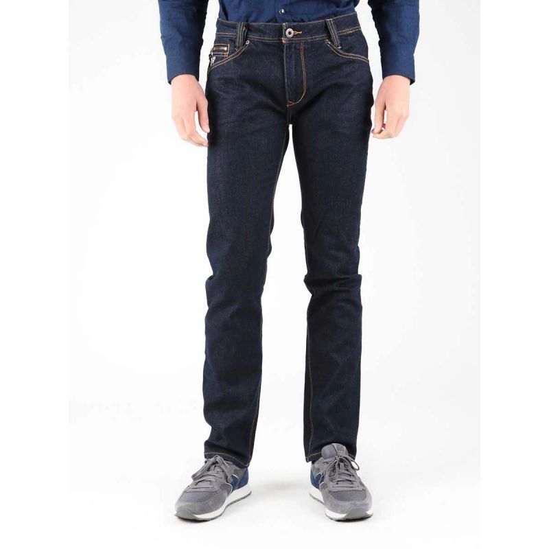 Herrenjeans mit geradem Bein und Reißverschluss. Große Vorder- und Gesäßtaschen. Eine kleine Tasche auf der Vorderseite hat einen Reißverschluss und einen dekorativen Riemen. Material: 99% Baumwolle/1% Elasthan