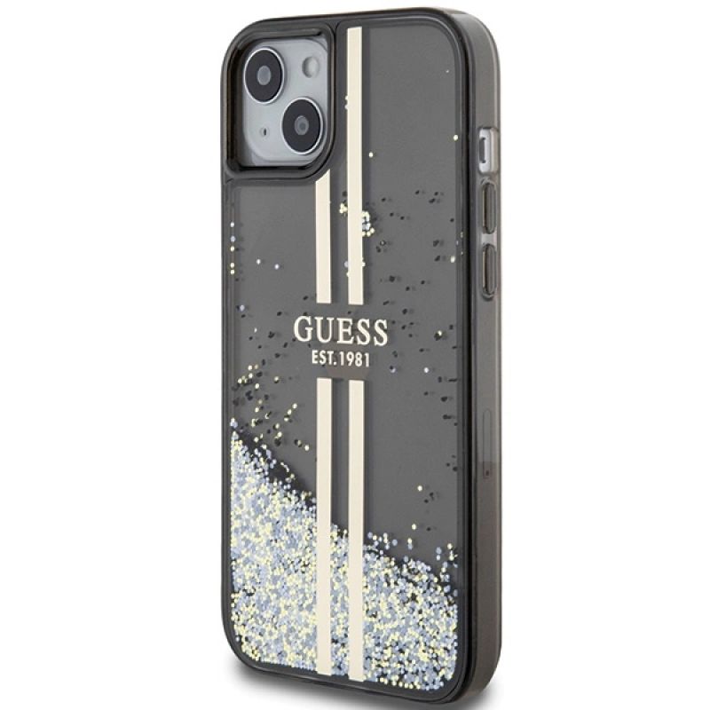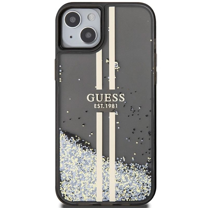Guess Liquid Glitter Gold Stripes Hülle für iPhone 15 Plus / 14 Plus – Schwarz