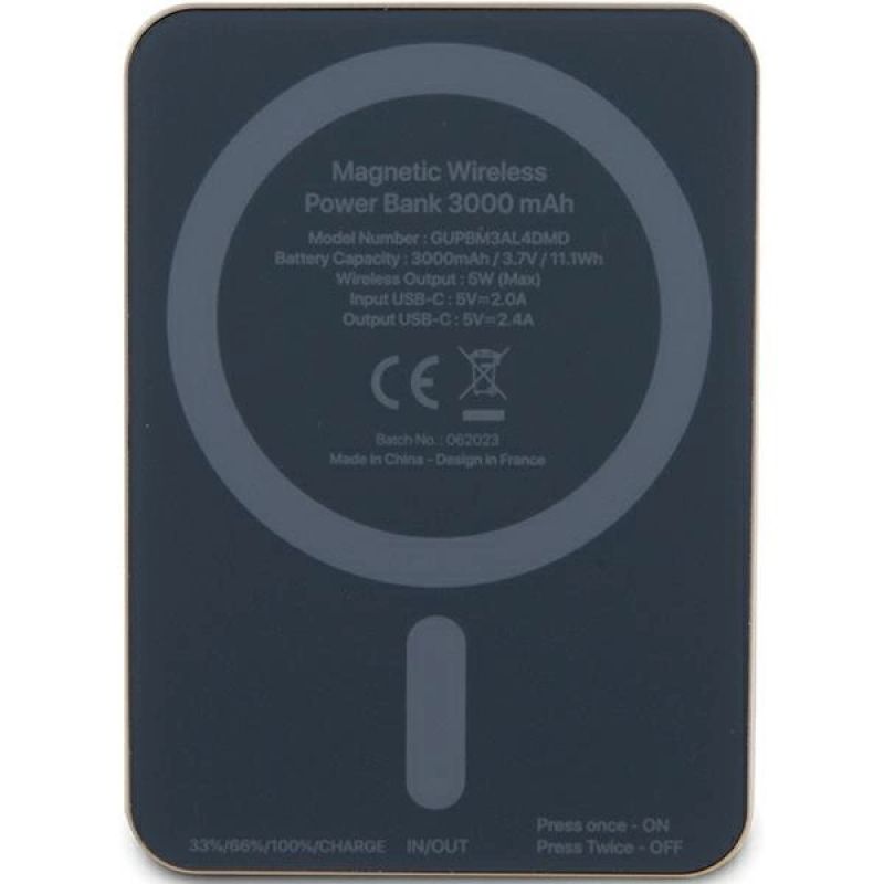 Sammlung 4G Strass-Metalllogo MagSafe Typ Drahtlose Powerbank Material Aluminium/Silikon Kapazität 3000 mAh / 3,7 V / 11,1 Wh Maße 83x60x14mm Kabellose Ladeleistung 5 W (maximal) USB-C-Eingang 5V⎓2,0A USB-C-Ausgang 5V⎓2,4A Stromversorgung USB-C Farbe Golden Inbegriffen 1x Guess Metal Script Logo MagSafe Powerbank,1x USB-C-Kabel 30cm
