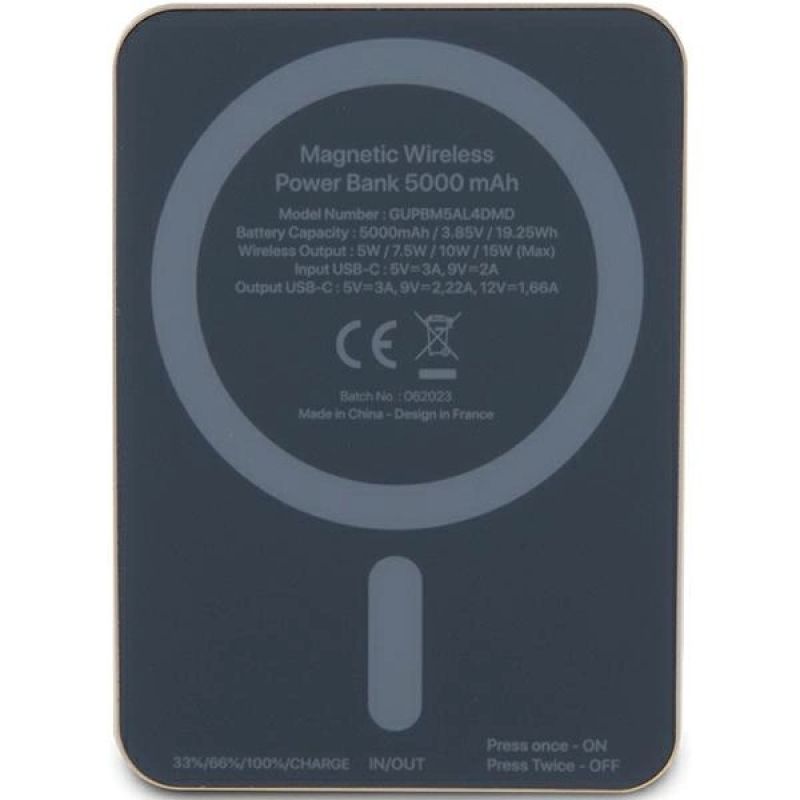 Sammlung Metallschriftzug-Logo MagSafe Typ Drahtlose Powerbank Material Aluminium/Silikon Kapazität 5000 mAh / 3,85 V / 19,25 Wh Maße 83x60x14mm Kabellose Ladeleistung 5 W / 7,5 W / 10 W / 15 W (maximal) USB-C-Eingang 5V⎓3A, 9V⎓2A USB-C-Ausgang 5V⎓3A, 9V⎓2,22A, 12V⎓1,66A Stromversorgung USB-C Farbe Golden Inbegriffen 1x Guess Metal Script Logo MagSafe Powerbank,1x USB-C-Kabel 30cm