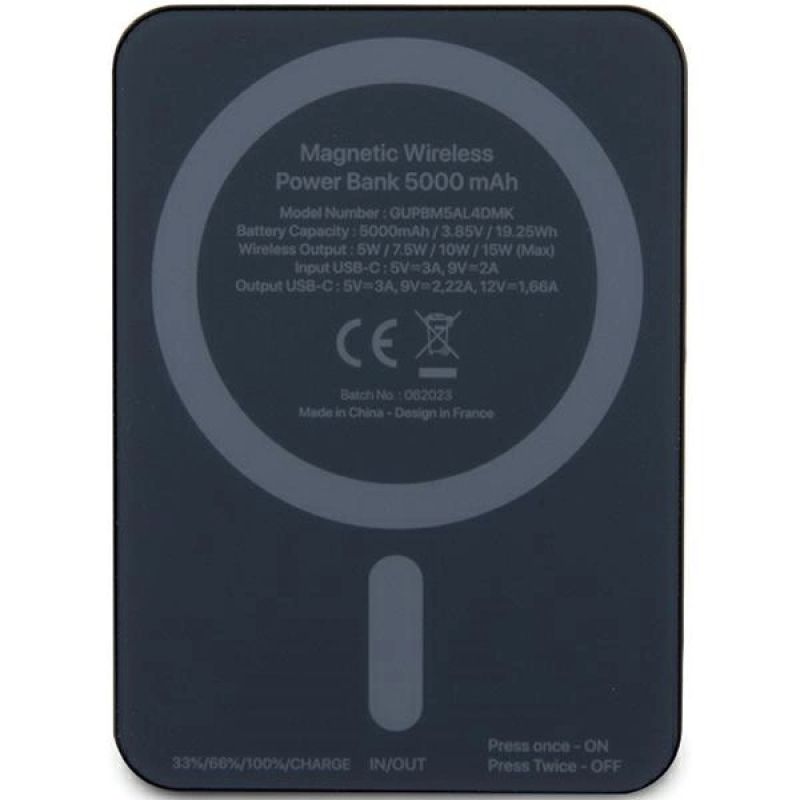 Sammlung Metallschriftzug-Logo MagSafe Typ Drahtlose Powerbank Material Aluminium/Silikon Kapazität 5000 mAh / 3,85 V / 19,25 Wh Maße 83x60x14 mm Kabellose Ladeleistung 5 W / 7,5 W / 10 W / 15 W (maximal) USB-C-Eingang 5V⎓3A, 9V⎓2A USB-C-Ausgang 5V⎓3A, 9V⎓2,22A, 12V⎓1,66A Stromversorgung USB-C Farbe Schwarz Inbegriffen 1x Guess Metal Script Logo MagSafe Powerbank,1x USB-C-Kabel 30cm