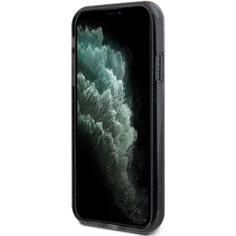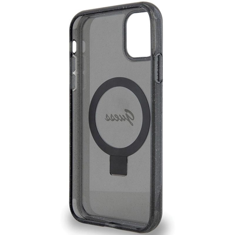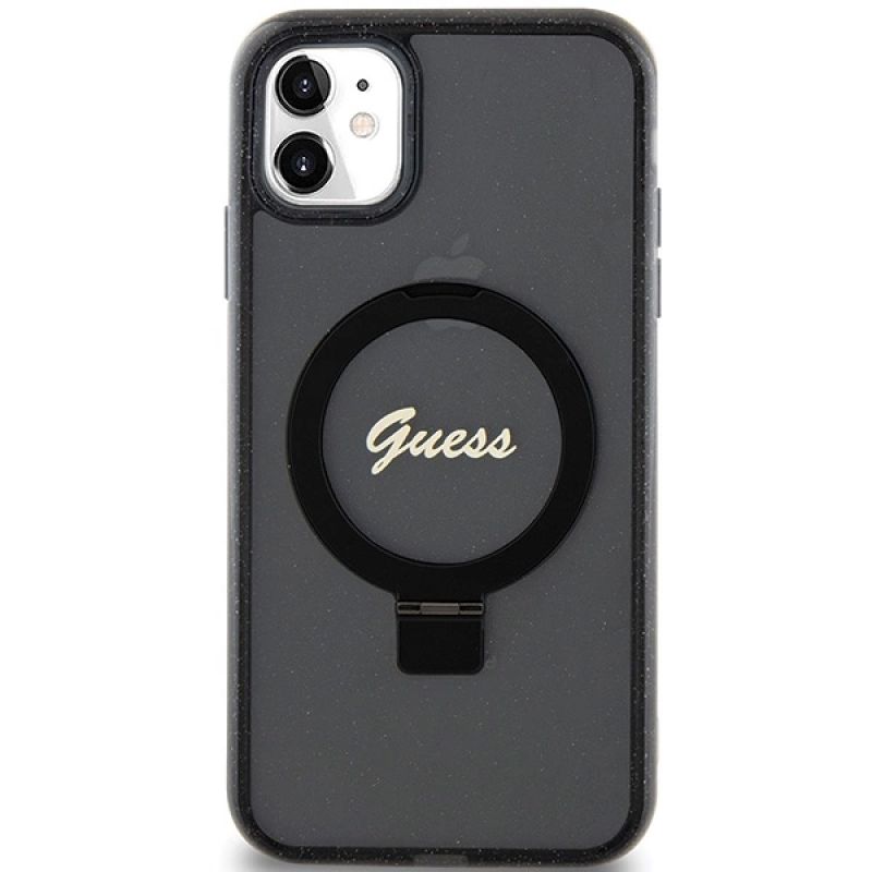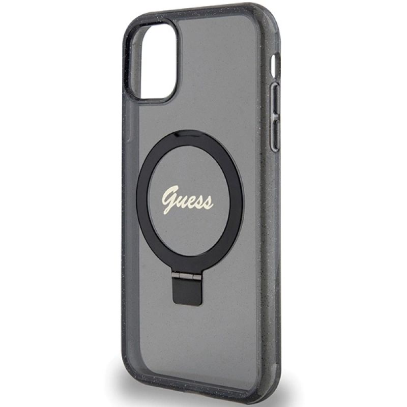 Guess Ring Stand Script Glitter MagSafe-Hülle für iPhone 11 / Xr – Schwarz