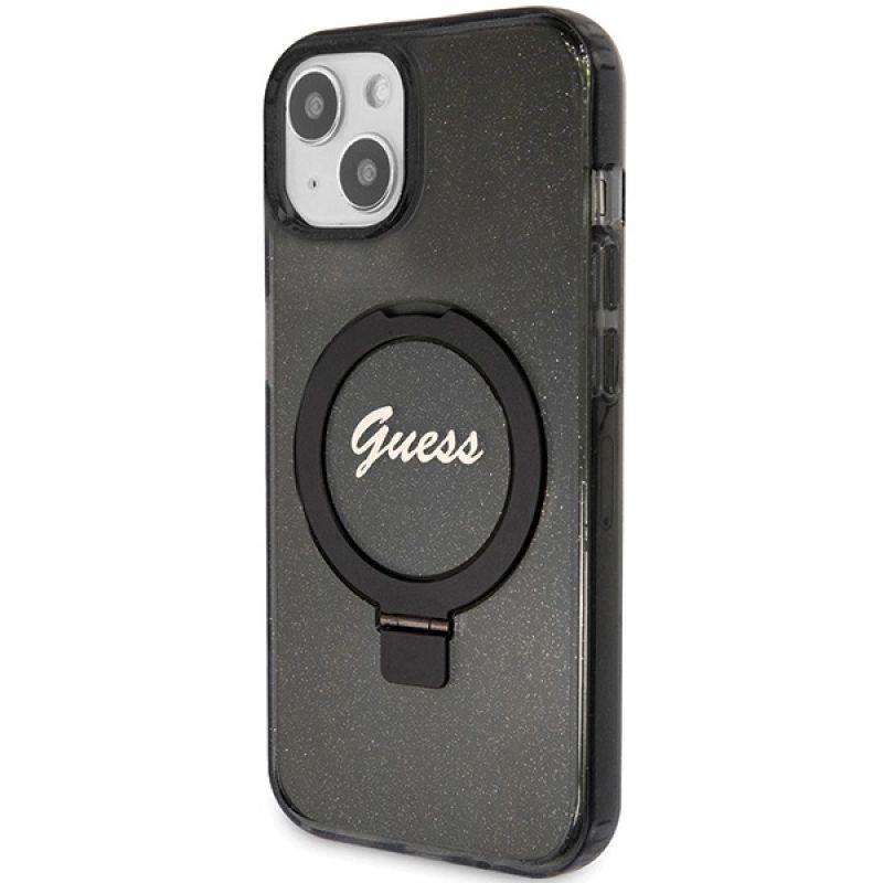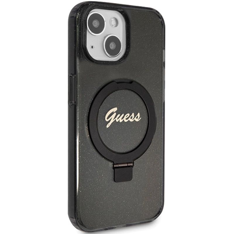 Guess Ring Stand Script Glitter MagSafe-Hülle für iPhone 14 / 15 / 13 – Schwarz