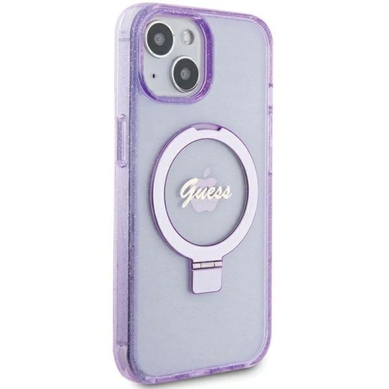 Guess Ring Stand Script Glitter MagSafe Hülle für iPhone 15 Plus / 14 Plus – Lila