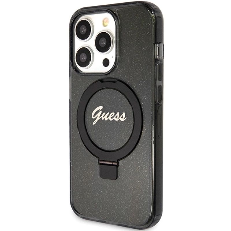 Guess Ring Stand Script Glitter MagSafe Hülle für iPhone 15 Pro – Schwarz