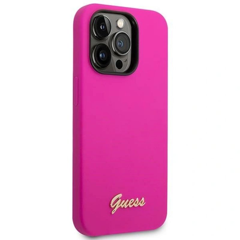 Guess Silikonhülle mit Vintage-Goldlogo für iPhone 14 Pro – Fuchsia