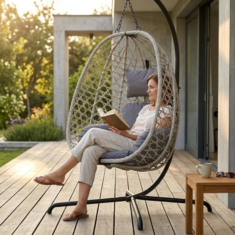 Der Hängesessel COCOON mit 195 cm großem Gestell in Dunkelbraun und 120 kg Gewicht vereint Funktionalität mit stilvollem Design. Dank seines stabilen Fußes (100 x 100 x 196 cm) benötigt er keine Decken- oder Balkenbefestigung. Er eignet sich perfekt für Garten, Terrasse, Balkon oder auch das Wohnzimmer und schafft einen komfortablen Platz zum Lesen, Entspannen oder einfach nur zum Abschalten.