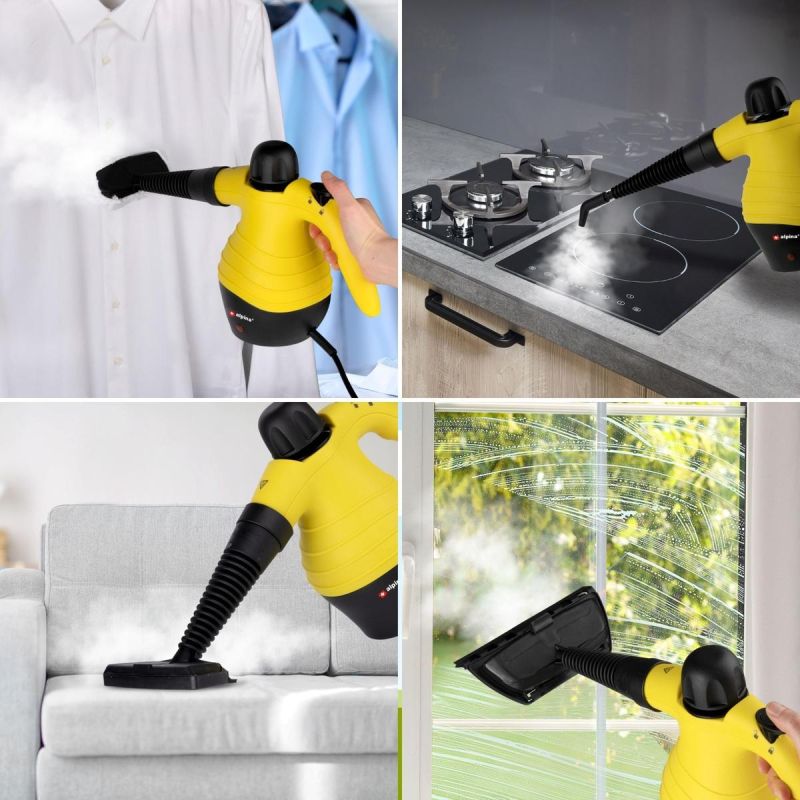 Der ALPINA 900–1050W Handdampfreiniger entfernt Schmutz, Fett und Bakterien ausschließlich mit heißem Dampf – schnell, umweltfreundlich und mühelos.