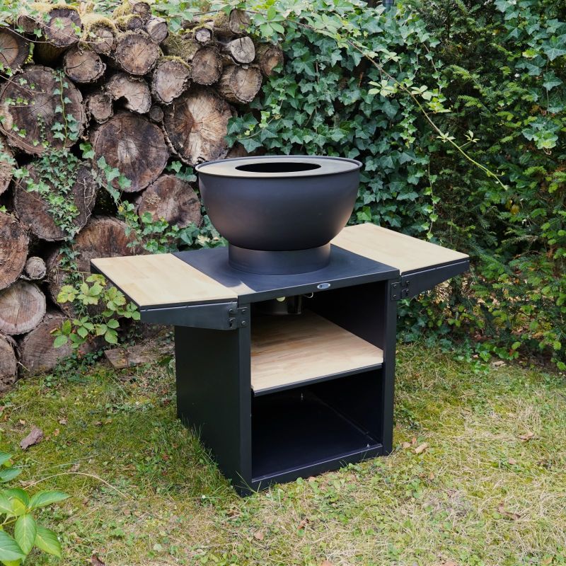 Zwei klappbare Seitenablagen mit jeweils 30 cm Breite eignen sich ideal zum Zerkleinern von Zutaten, Zubereiten und Servieren von Speisen. Praktische Ablagefächer unter der Schüssel bieten zusätzlichen Platz für Holz oder Zubehör und erleichtern so die Arbeit. Der Kocher steht auf stabilen, verstellbaren Füßen, die eine Höhenanpassung an individuelle Bedürfnisse ermöglichen und den Komfort erhöhen.