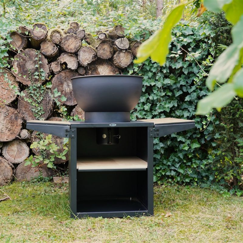 Zwei klappbare Seitenablagen mit jeweils 30 cm Breite eignen sich ideal zum Zerkleinern von Zutaten, Zubereiten und Servieren von Speisen. Praktische Ablagefächer unter der Schüssel bieten zusätzlichen Platz für Holz oder Zubehör und erleichtern so die Arbeit. Der Kocher steht auf stabilen, verstellbaren Füßen, die eine Höhenanpassung an individuelle Bedürfnisse ermöglichen und den Komfort erhöhen.
