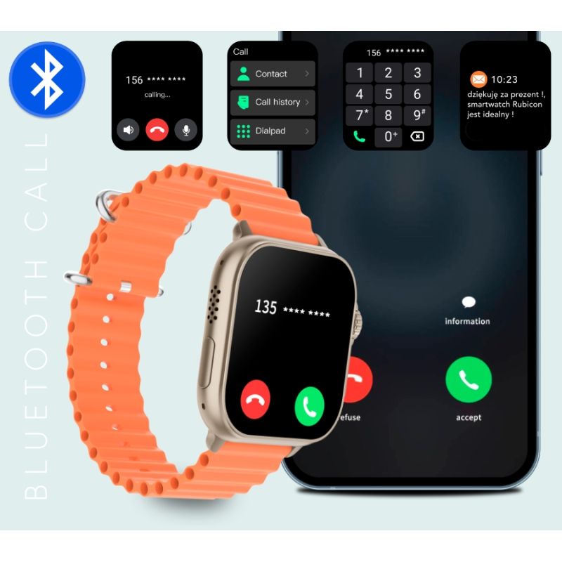 Lernen Sie die Smartwatch kennen, die alles richtig macht. Stilvoll. Funktional. Bereit für jede Herausforderung. Das Gehäuse aus Titanlegierung ist hypoallergen und widerstandsfähig gegen alltägliche Abnutzung. Das gerippte Silikonarmband ist nicht nur bequem, sondern auch robust und charaktervoll. Flexibel, langlebig und passgenau schmiegt es sich perfekt an Ihr Handgelenk an. Seine moderne Form verleiht der Uhr einen robusten, technischen Look. Der große 1,39-Zoll-TFT-IPS-Touchscreen mit einer Auflösung von 360 x 360 Pixeln überzeugt durch Schärfe, Schnelligkeit und einwandfreie Bedienung. Sieben voreingestellte Zifferblätter, Animationen und individuelle Designs – jeden Tag ein anderer Stil, aber immer die gleiche Leistung. Bluetooth-Anrufe mit Mikrofon und Lautsprecher ? Selbstverständlich. Sie können Anrufe direkt am Handgelenk annehmen und tätigen. Anruflisten, bis zu 100 Kontakte – alles ist griffbereit, oder besser gesagt, direkt am Handgelenk. Und alles ist auf Polnisch – die Uhr, das Menü, die App.
