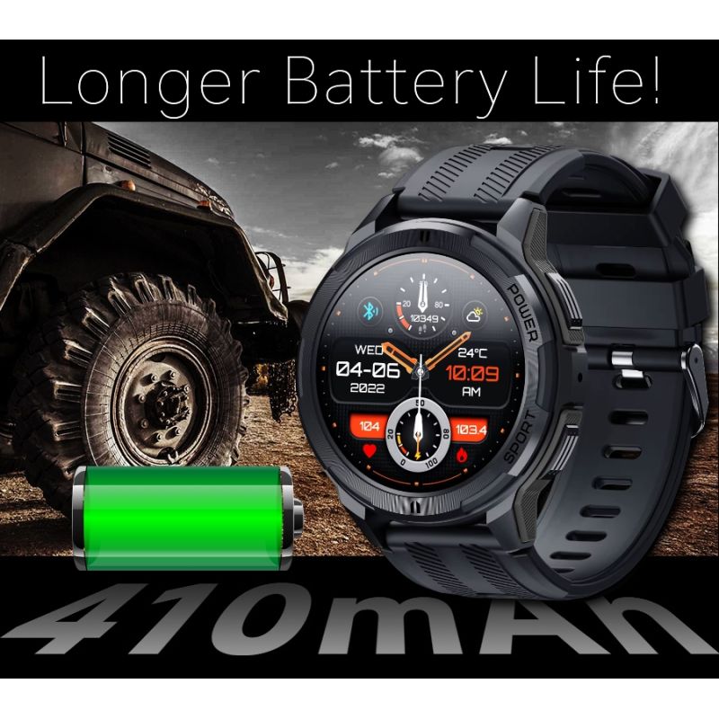 Der langlebige 410-mAh -Akku ermöglicht stundenlange Nutzung ohne häufiges Aufladen. Dank 1 ATM Wasserdichtigkeit sind Regen, Schweiß oder kurzes Händewaschen kein Problem. Sie können Ihre Smartwatch bedenkenlos beim Gewichtheben, Wandern oder im Alltag einsetzen. Das Silikonarmband garantiert hohen Tragekomfort – egal ob im Anzug beim Geschäftstreffen oder in Sportkleidung beim Training.