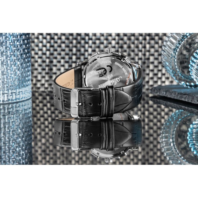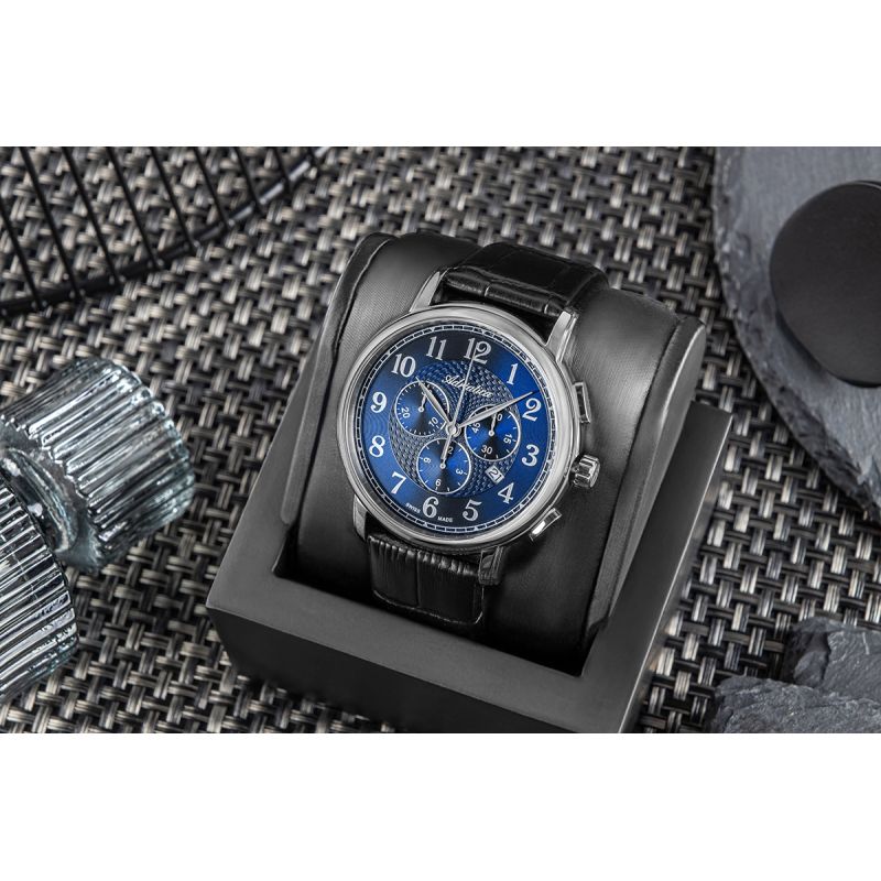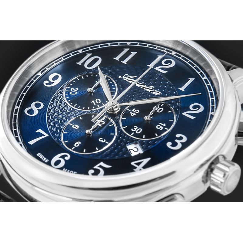 Die Herrenuhr Adriatica A8256.5225CH ist eine Hommage an klassischen Stil, Schweizer Präzision und Handwerkskunst, die ohne Übertreibung Aufmerksamkeit erregt. Ihr Herzstück ist ein zuverlässiges Schweizer Quarzwerk, das für den täglichen Gebrauch und perfekte Pünktlichkeit entwickelt wurde – unabhängig von Ihrem Lebensrhythmus. Drei elegant integrierte Chronographen-Hilfszifferblätter bieten nicht nur Funktionalität, sondern auch eine sportliche Note – sie ermöglichen sekundengenaue Zeitmessung und fügen sich gleichzeitig harmonisch in das klassische Design ein. Zeiger und arabische Ziffern sind gut ablesbar, und der dezente Glanz sowie die elegante Zifferblattstruktur , die sich im Licht subtil verändert, unterstreichen den Gesamteindruck. Das Zifferblatt ist durch kratzfestes Saphirglas geschützt und bewahrt so alles, was Ihnen am wichtigsten ist. Das 42-mm-Edelstahlgehäuse ist ergonomisch geformt und schmiegt sich angenehm ans Handgelenk – robust und dennoch dezent. Abgerundet wird das Design durch ein klassisches Armband aus schwarzem Echtleder mit leichtem Glanz und einer Prägung, die an Krokodilleder erinnert.