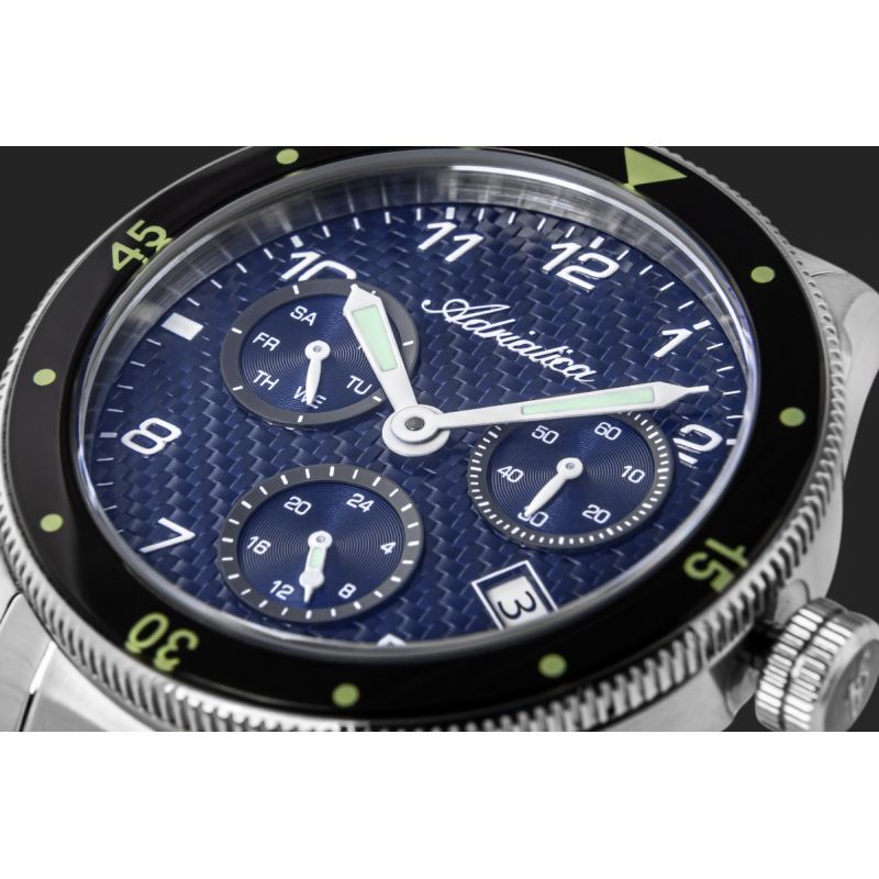 Dieses Modell wurde mit Blick auf Präzision und optimale Ablesbarkeit entworfen. Das Zifferblatt vereint sportlichen Charakter mit dem Gespür eines Uhrmachers für harmonische Proportionen. Markante arabische Ziffern und Indizes sorgen für eine intuitive, klare und sofort einsatzbereite Darstellung. Die drei Hilfszifferblätter – Wochentag, 24-Stunden-Anzeige und Sekundenzähler – sind übersichtlich und harmonisch angeordnet. Leuchtzeiger ermöglichen sicheres Ablesen, selbst im Dunkeln. Jedes Element hat seinen Platz – jedes Detail trägt zu optimaler Ablesbarkeit und Funktionalität bei.