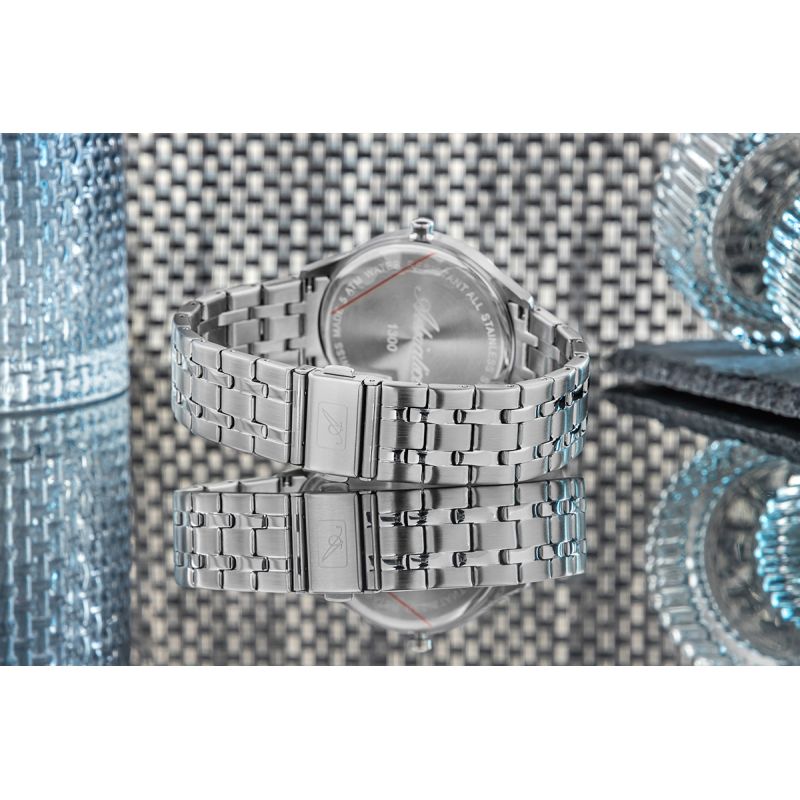 Die Uhr wird in einer eleganten Adriatica-Markenbox in klassischem Schwarz und Creme geliefert, die mit einem dezenten Markenlogo verziert ist. Die gesamte Verpackung spiegelt perfekt die Schweizer Präzision und das Prestige der Marke Adriatica wider. Zum Set gehört außerdem ein elegantes Mikrofasertuch mit Markenlogo – ideal zum Reinigen von Zifferblatt und Armband, um den Glanz der Uhr Tag für Tag zu erhalten.