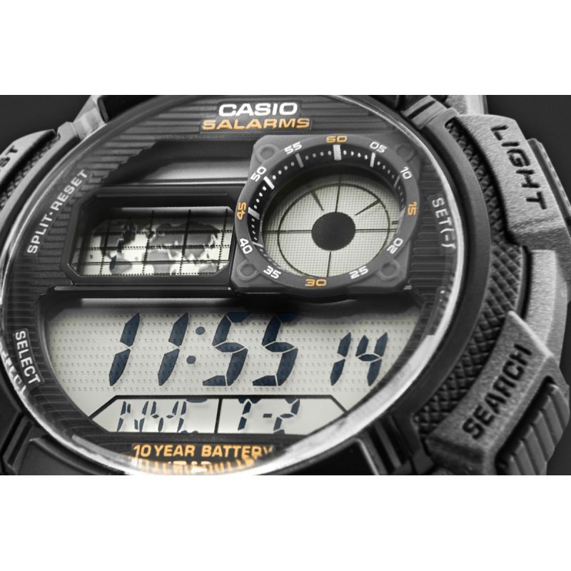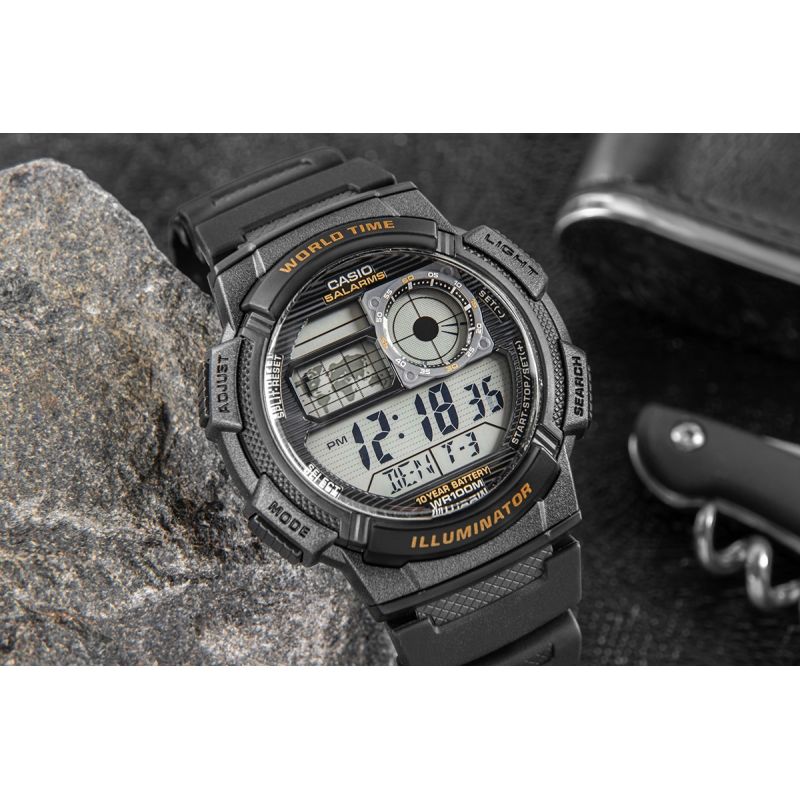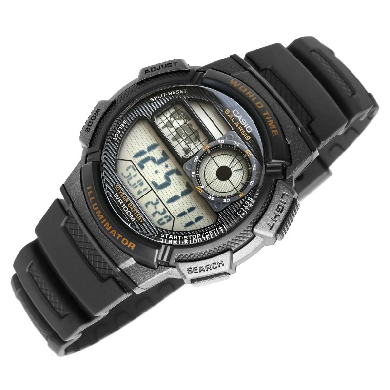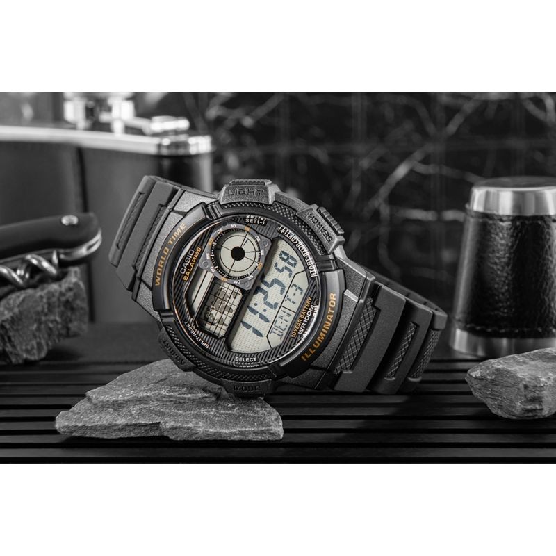 Dieses CASIO-Modell bietet Multi-Time, Weltzeit, Stoppuhr, 5-fachen Alarm und Countdown-Timer – und das alles mit einer einzigen Batterie für 10 Jahre. Die Casio AE-1000W ist eine Uhr, die mit Ihnen Schritt hält: Ihr vom Cockpit inspiriertes Zifferblatt verleiht ihr einen robusten, technischen Charakter, der maskulinen Stil und einen dynamischen Lebensstil unterstreicht. Dank Weltkarte und Weltzeitfunktion haben Sie die Zeit in verschiedenen Zeitzonen immer im Blick und können sie so ideal für Reisende und international tätige Berufstätige nutzen. Das LC-Analogdisplay zeigt Ihnen stets die Zeit Ihrer Heimatstadt an, und die Wasserdichtigkeit bis 100 Meter ermöglicht den komfortablen Einsatz auch unter anspruchsvollen Bedingungen. Diese Uhr ist für Männer, die mehr erwarten – Präzision, Langlebigkeit und Stil.