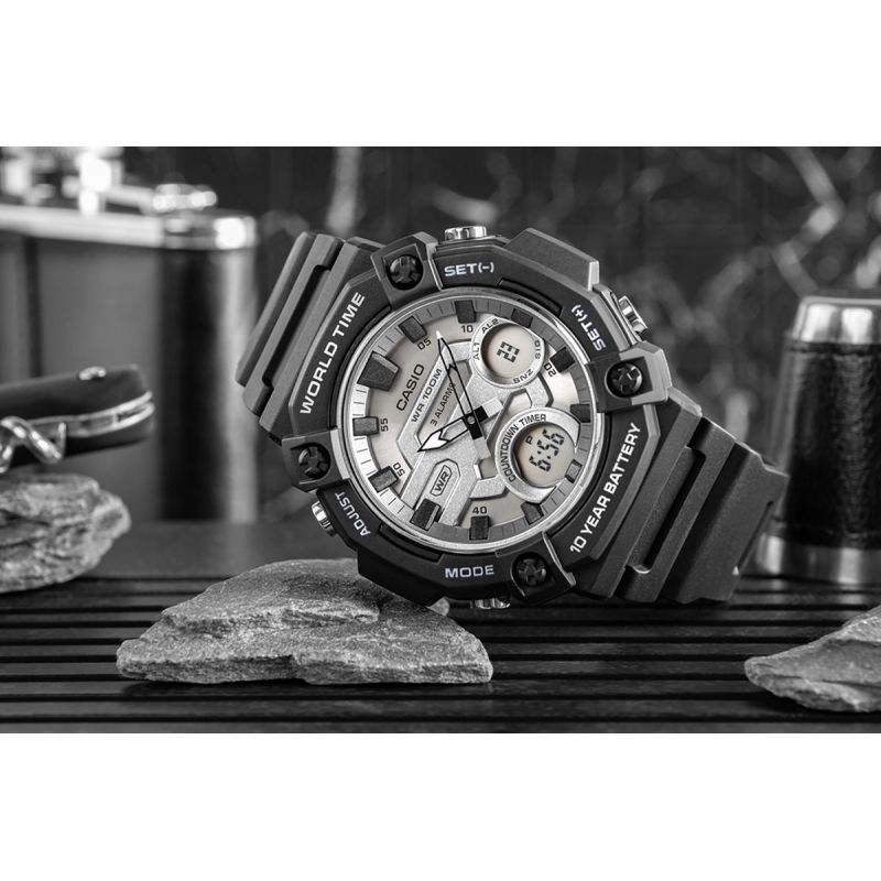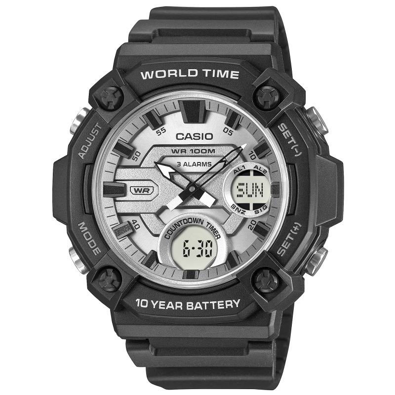 Die CASIO AEQ-120W vereint Funktionalität mit Abenteuerbereitschaft und besticht durch ihr markantes, robustes Design und das große Gehäuse. Die breite Lünette und das gewölbte Zifferblatt garantieren optimale Ablesbarkeit und unterstreichen den maskulinen, selbstbewussten Charakter der Uhr. Wasserdicht bis 100 Meter und eine Batterielaufzeit von bis zu 10 Jahren gewährleisten Zuverlässigkeit. Zusätzliche Funktionen wie drei Alarme, ein Timer und die Weltzeit sorgen dafür, dass Sie Ihren Tag immer im Griff haben – egal wo Sie sind. TELEMEMO (30 Einträge) ist eine praktische Lösung, mit der Sie wichtige Kontakte speichern können, ohne Ihr Smartphone zu benutzen. Dies ist besonders in Notfällen oder bei Outdoor-Aktivitäten hilfreich. Zusätzlich bietet diese Funktion eine Anzeige des verfügbaren Speicherplatzes und eine automatische Sortierung der gespeicherten Daten.