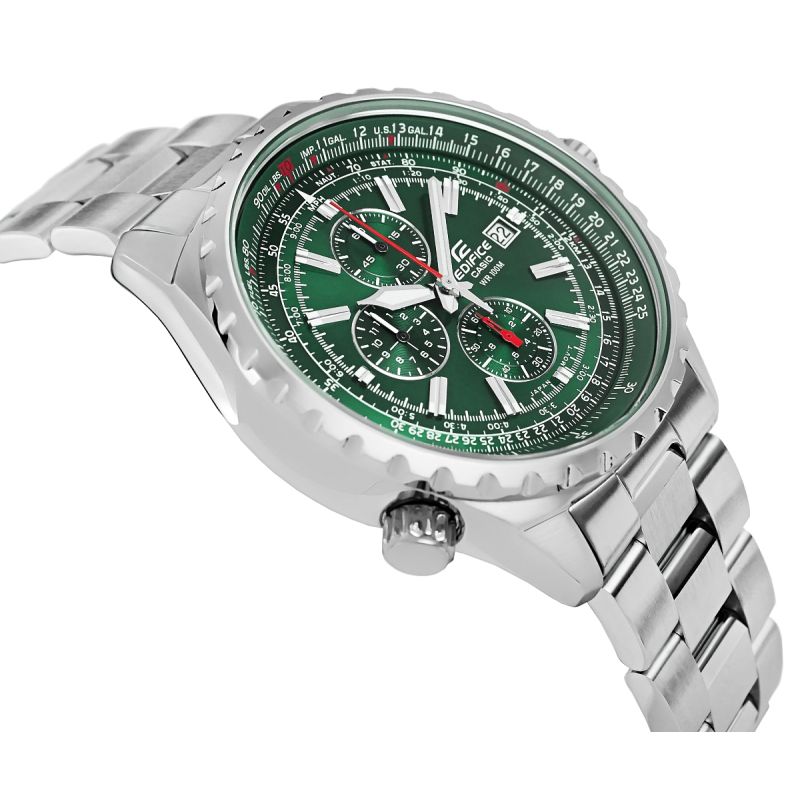 Ein Modell für Männer, die Wert auf Präzision, Funktionalität und technisches Design legen. Was steckt im Inneren? Die Uhr verfügt über eine 1/20-Sekunden-Stoppuhr und eine drehbare logarithmische Schieberskala, die präzise Messungen und Berechnungen von Zeit, Geschwindigkeit, Kraftstoffverbrauch und vielen weiteren Parametern ermöglicht. Das robuste Edelstahlarmband mit kleineren, abgerundeten Segmenten sorgt für optimalen Tragekomfort, während die geriffelte Lünette, die präzisen Stundenmarkierungen auf dem Zifferblatt und das Mineralglas der Uhr ein technologisch fortschrittliches Design verleihen.