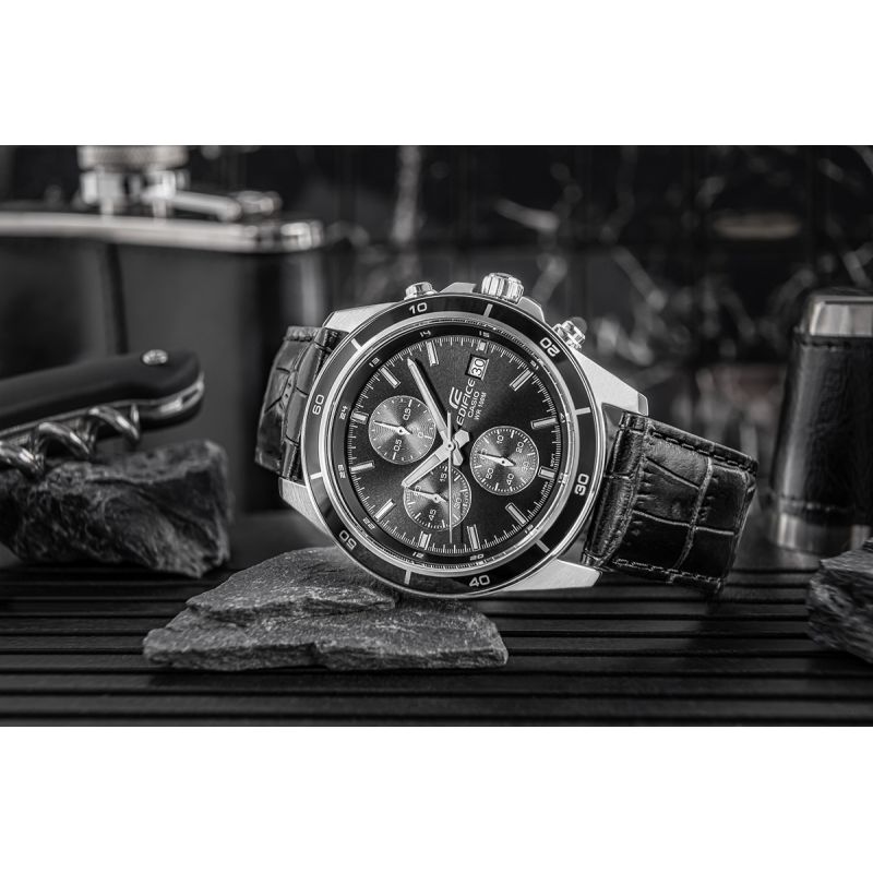 Ein mittelgroßer, klassischer EDIFICE- Chronograph. Dank seiner Vielseitigkeit und des schwarzen Lederarmbands passt die Uhr sowohl zu lässigen als auch zu sportlichen Outfits. Ausgestattet mit Datums- und Wochentagsanzeige bietet sie außerdem Chronographenfunktionen: 1/10-Sekunden-Stoppuhr, Sekunden- und Minutenzähler. Die Wasserdichtigkeit bis 10 bar ermöglicht es Ihnen, die Uhr bedenkenlos beim Schwimmen, Sport oder anderen Wassersportarten zu tragen. Eine fluoreszierende Hintergrundbeleuchtung sorgt dafür, dass Sie die Zeit auch im Dunkeln stets im Blick haben.