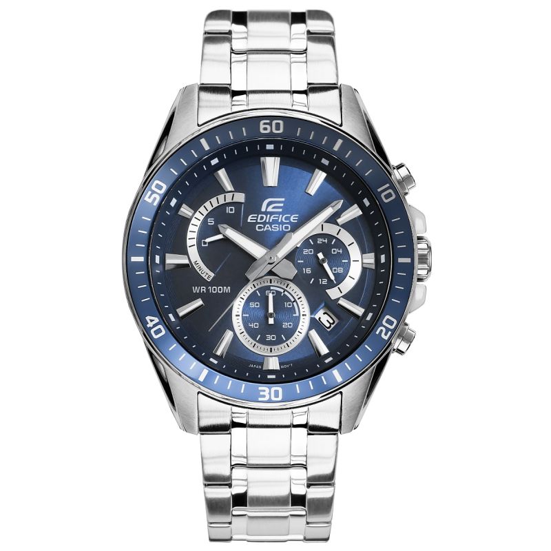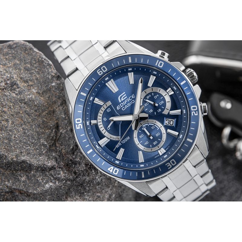 Ein großer, klassischer EDIFICE-Chronograph mit retrograder Anzeige bei 10 Uhr. Lünette, Indizes, Zeiger und ein Teil des Hilfszifferblatts sind in einem sportlichen Blauton gehalten, was der Uhr einen dynamischen und modernen Look verleiht. Ausgestattet mit Datumsanzeige und Chronographenfunktionen: Stoppuhr (Sekunden, Minuten) und 24-Stunden-Chronograph. Dank der Wasserdichtigkeit bis 10 bar können Sie die Uhr bedenkenlos zum Schwimmbad, zum Training oder zu Wassersportaktivitäten mitnehmen. Die fluoreszierende Hintergrundbeleuchtung sorgt dafür, dass Sie die Zeit auch im Dunkeln stets im Blick haben.
