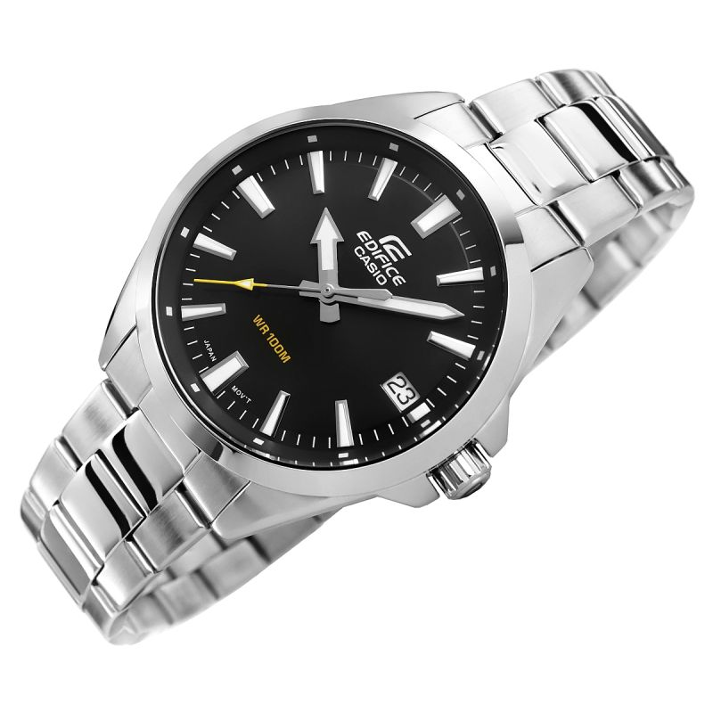 Diese elegante EDIFICE-Uhr besticht durch ihr längliches Gehäuse mit integriertem Armband, das für einen angenehmen Tragekomfort sorgt. Der markante, pfeilförmige Stundenzeiger hebt sich deutlich vom Zifferblatt ab und ermöglicht so ein schnelles Ablesen der Uhrzeit. Zusätzlich verfügt das Modell über eine Kalenderfunktion und vereint so Stil und Funktionalität. Das präzise Quarzwerk und das robuste Edelstahlgehäuse verleihen der Uhr einen modernen und eleganten Charakter. Dank Wasserdichtigkeit bis 10 bar können Sie die Uhr bedenkenlos im Wasser tragen, und die fluoreszierende Hintergrundbeleuchtung gewährleistet optimale Ablesbarkeit auch im Dunkeln.