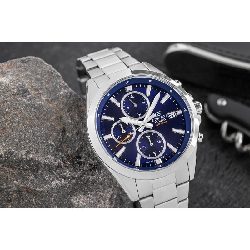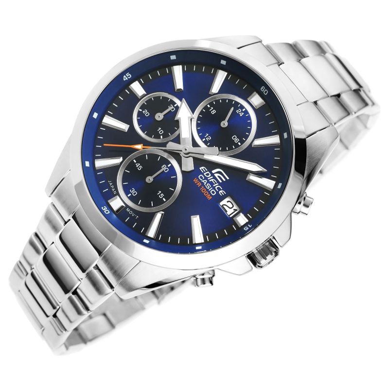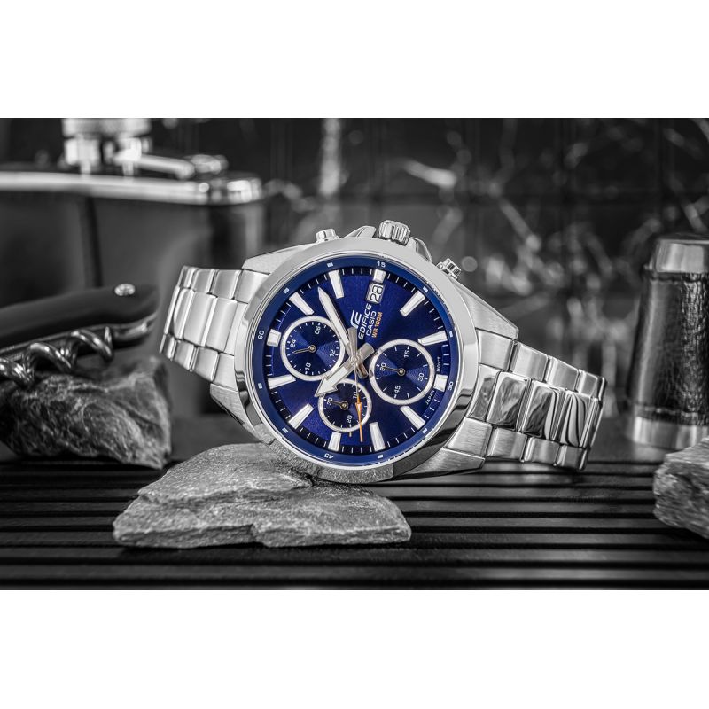Finden Sie die perfekte Balance aus Stil und Präzision mit dem klassischen, mittelgroßen EDIFICE Chronographen. Die Uhr besticht durch eine raffinierte Kombination aus edlen Details und modernem Design. Die schmale Lünette bildet einen schönen Kontrast zum breiten Zifferblatt und verleiht der Uhr einen unverwechselbaren, eleganten Charakter. Ausgestattet mit Datums- und Wochentagsanzeige sowie Chronographenfunktionen: 24-Stunden-Anzeige, Stoppuhr (Minuten) und Stoppuhr (Sekunden). Dank Wasserdichtigkeit bis 10 bar können Sie die Uhr bedenkenlos beim Schwimmen, Sport oder anderen Wassersportarten tragen. Die fluoreszierende Hintergrundbeleuchtung sorgt dafür, dass Sie die Zeit auch im Dunkeln stets im Blick haben.