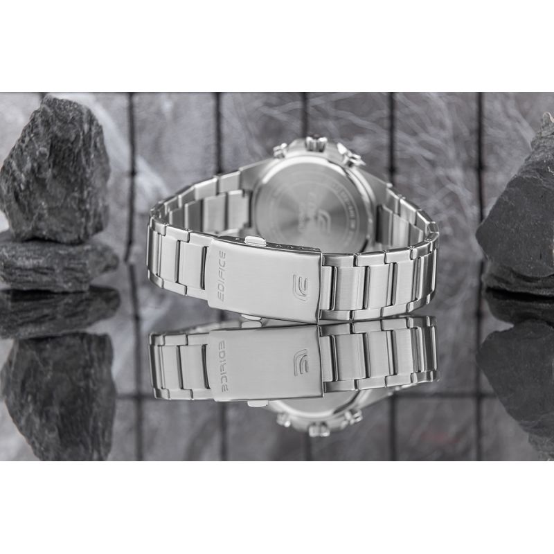 Ein komfortables Stahlarmband ist die perfekte Ergänzung zu dieser Uhr. Dieses Armband garantiert Langlebigkeit und hohen Tragekomfort im Alltag. Der hochwertige Stahl sorgt für zusätzlichen Komfort und schmiegt sich angenehm an jedes Handgelenk. Die Schließe trägt das Edifice-Logo, was die Exklusivität der Uhr unterstreicht und sie von anderen Uhrenmarken abhebt.