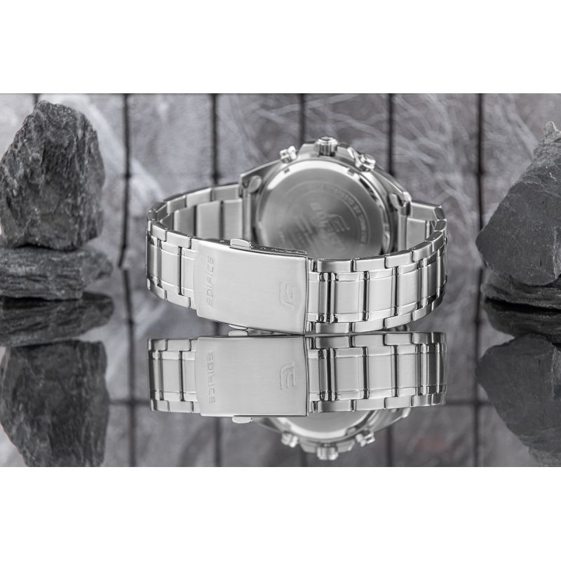Ein komfortables Stahlarmband ist die perfekte Ergänzung zu dieser Uhr. Dieses Armband garantiert Langlebigkeit und hohen Tragekomfort im Alltag. Der hochwertige Stahl sorgt für zusätzlichen Komfort und schmiegt sich angenehm an jedes Handgelenk. Die Schließe trägt das Edifice-Logo, was die Exklusivität der Uhr unterstreicht und sie von anderen Uhrenmarken abhebt.