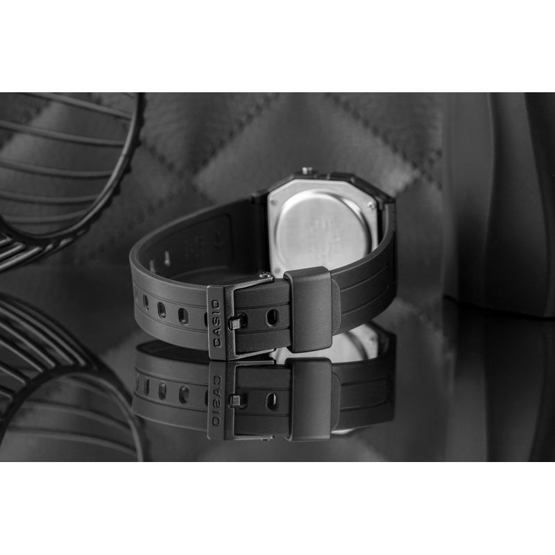 Die Uhr verfügt über ein Armband aus robustem Kunststoff, typisch für Casio-Modelle, bei denen Langlebigkeit und Tragekomfort im Vordergrund stehen. Das Armband ist besonders leicht, sodass die Uhr auch nach längerem Tragen angenehm zu tragen ist. Da der Kunststoff keine Feuchtigkeit aufnimmt, ist die Uhr spritzwassergeschützt. So wird das Armband durch alltäglichen Wasserkontakt, wie Händewaschen oder leichten Regen, nicht beschädigt. Das Kunststoffarmband lässt sich leicht reinigen; wischen Sie es einfach mit einem feuchten Tuch ab, um Schmutz zu entfernen. Der Kunststoff löst selten allergische Reaktionen aus, wodurch diese Uhr auch für Menschen mit empfindlicher Haut geeignet ist.