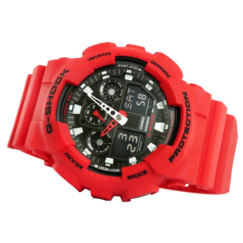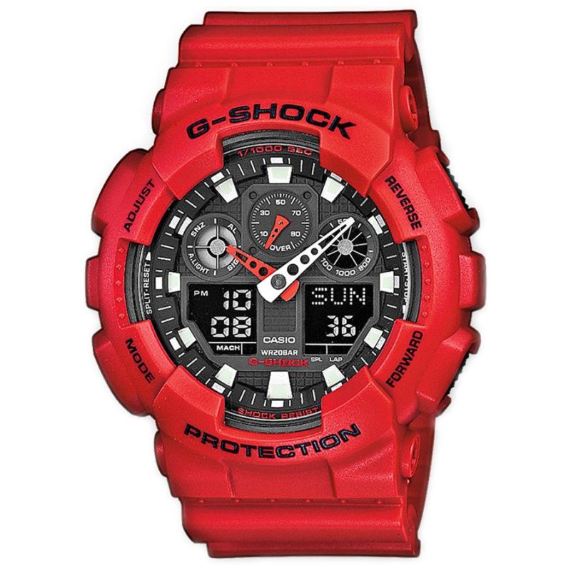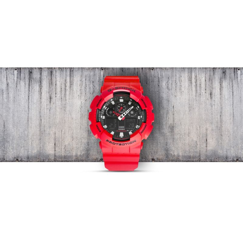 Die CASIO G-SHOCK GA-100B-4AER Herrenuhr bietet folgende Funktionen: Stoppuhr, 5 Alarme, Wecker, Datumsanzeige. Hintergrundbeleuchtung: Die Uhr verfügt über eine LED-Hintergrundbeleuchtung, die das Zifferblatt dezent und dennoch hell ausleuchtet. Weltzeitanzeige mit mehreren Zeitzonen. Automatischer Kalender mit vorprogrammierten Daten bis 2099. Die Uhr passt das Datum automatisch an kürzere Monate an. 1/10-Sekunden-Timer. Zusätzlich verfügt die Uhr über eine Countdown-Funktion mit Rückwärtszähler, einstellbar von 1 Sekunde bis 24 Stunden.