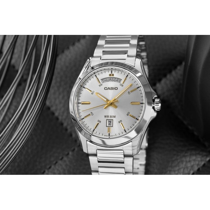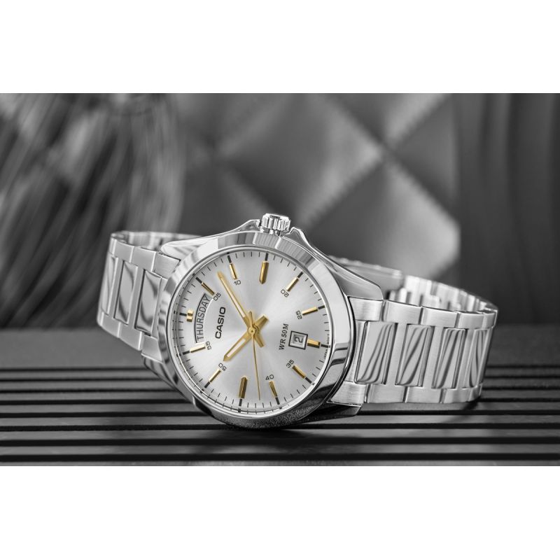 Ein CASIO-Modell, das klassische Eleganz mit praktischer Funktionalität vereint. Dank der Dual-Datumsanzeige, die sowohl Wochentag als auch Datum anzeigt, haben Sie die wichtigsten Informationen stets im Blick – ideal für Männer, die Wert auf Ordnung und Pünktlichkeit legen. Das robuste Edelstahlgehäuse und das segmentierte Armband bilden ein zuverlässiges Duo, das sich sowohl für den Alltag als auch für besondere Anlässe eignet.