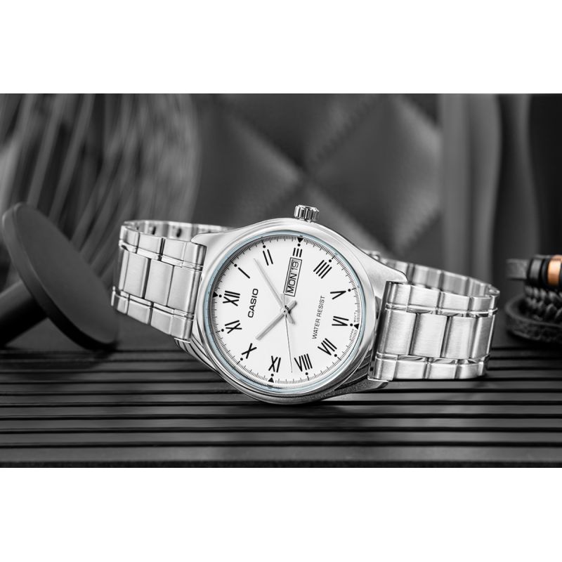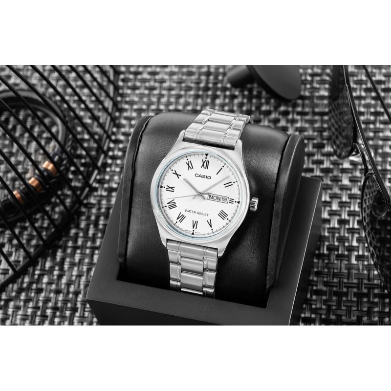 Die Casio MTP-V006D ist ein Modell für alle, die klare Linien und zeitloses Design schätzen – frei von unnötigen Details, aber mit vollem Respekt vor klassischem Stil. Die Uhr besticht durch ihr schlankes 38-mm- Gehäuse und ein transparentes Zifferblatt mit filigranen Zeigern und eleganten römischen Ziffern. Dank der zeitlosen Anordnung der Zeiger – Stunden, Minuten und Sekunden – passt sie mühelos zu jedem Anlass, ob leger oder formell. Die Datumsanzeige bei 3 Uhr rundet das harmonische Design ab – dezent und doch praktisch. Das Gesamtdesign strahlt Ruhe, Ordnung und eine für sich sprechende Ästhetik aus. Das Edelstahlarmband verleiht der Uhr einen edlen Charakter und passt sowohl zum Hemdsärmel als auch zu legerer Kleidung – perfekt für Beruf, Meetings und den Alltag.