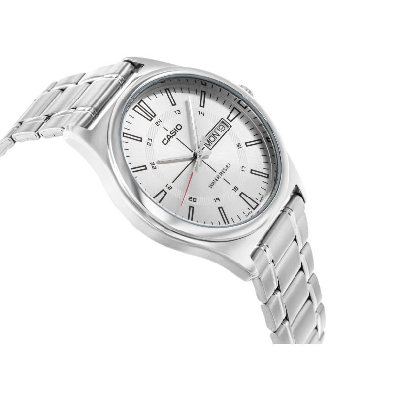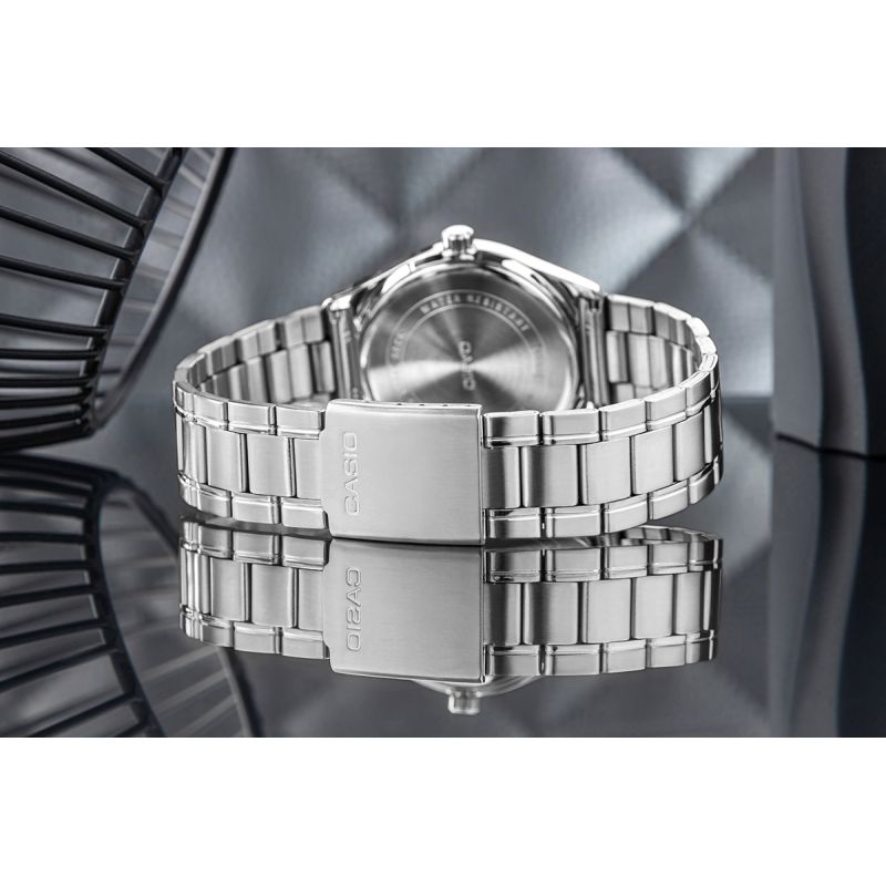 Dieses Herrenmodell aus der CASIO-Kollektion besticht durch sein klassisches 38-mm-Edelstahlgehäuse, ein gut ablesbares Zifferblatt mit markanten Stundenmarkierungen und einer zusätzlichen 24-Stunden-Skala für optimale Orientierung. Die Datumsanzeige bei 3 Uhr ermöglicht einen schnellen Überblick über Wochentag und Monat, während die Wasserdichtigkeit von 100 % sicheren Tragekomfort im Alltag gewährleistet. Das matte Edelstahlarmband verleiht der Uhr eine elegante Note, die sowohl zum Anzug als auch zu einem lässigen, urbanen Look passt. Das Quarzwerk garantiert die für Casio typische Präzision und Zuverlässigkeit.