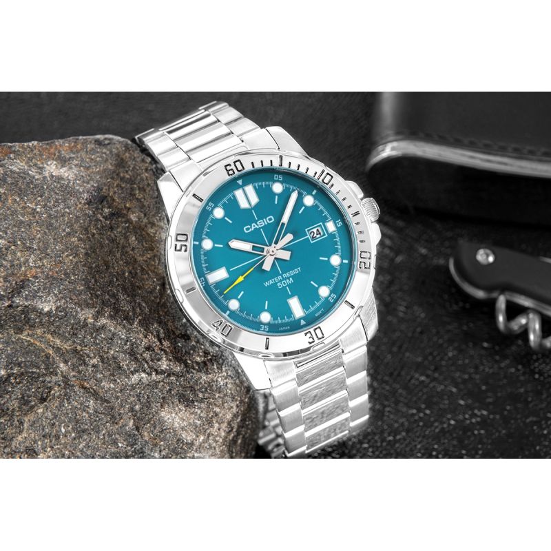 Ein kühnes und elegantes CASIO-Modell, das auf den ersten Blick alle Blicke auf sich zieht. Das 44-mm-Edelstahlgehäuse beherbergt ein türkisfarbenes Zifferblatt, das sofort Energie, Frische und Freiheit ausstrahlt. Kontrastierende weiße Indizes und markante Zeiger sorgen für optimale Ablesbarkeit, während der gelbe Sekundenzeiger jedem Augenblick eine dynamische Note verleiht. Die Datumsanzeige bei 3 Uhr ist ein praktisches Extra, das Ihnen hilft, Ihren Tagesablauf zu organisieren, und die Wasserdichtigkeit bis 50 m ermöglicht Ihnen absolute Bewegungsfreiheit – bei jedem Wetter. Ein Edelstahlarmband mit Dreifachfaltschließe rundet den Look ab und vereint Robustheit mit klassischem Stil.