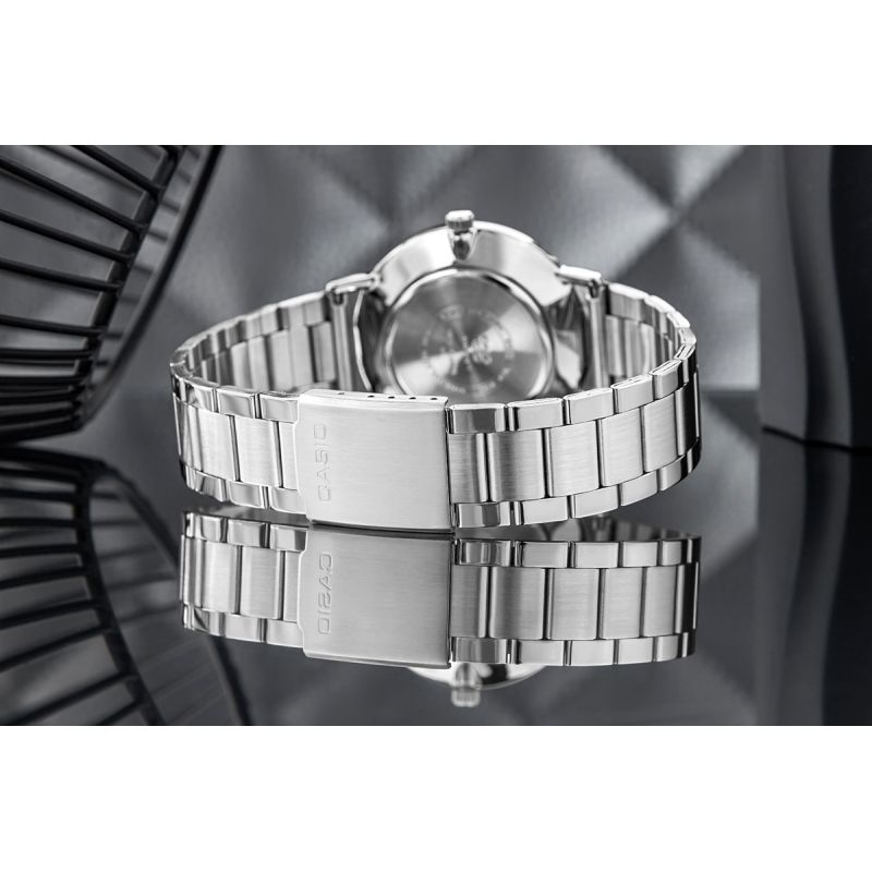 Die MTP-VT04D ist eine Hommage an puristisches Design – ohne Ablenkungen, ohne Komplikationen, ohne Lärm. Nur Sie und die Zeit – abgelesen auf einem perfekt ausbalancierten Zifferblatt, wo jede Linie Bedeutung hat und jede Sekunde im Rhythmus der Einfachheit fließt. Keine Ziffern? Kein Mangel – sondern eine bewusste Entscheidung. Kein Datum? Ebenso. Alles Überflüssige ist verschwunden, nur das Wesentliche bleibt: Ablesbarkeit, Ausgewogenheit und Ruhe. Die matte Oberfläche des Zifferblatts unterstreicht den modernen, minimalistischen Look. Diese Uhr passt sich Ihnen an, nicht umgekehrt. Sie passt perfekt unter eine Jackenmanschette oder zu Ihrem Lieblings-T-Shirt. Mit ihren schlanken (8,5 mm) und leichten (90 g) Uhren ist sie angenehm zu tragen und der ideale Begleiter für jeden Tag – nicht dominant, sondern eine perfekte Ergänzung.