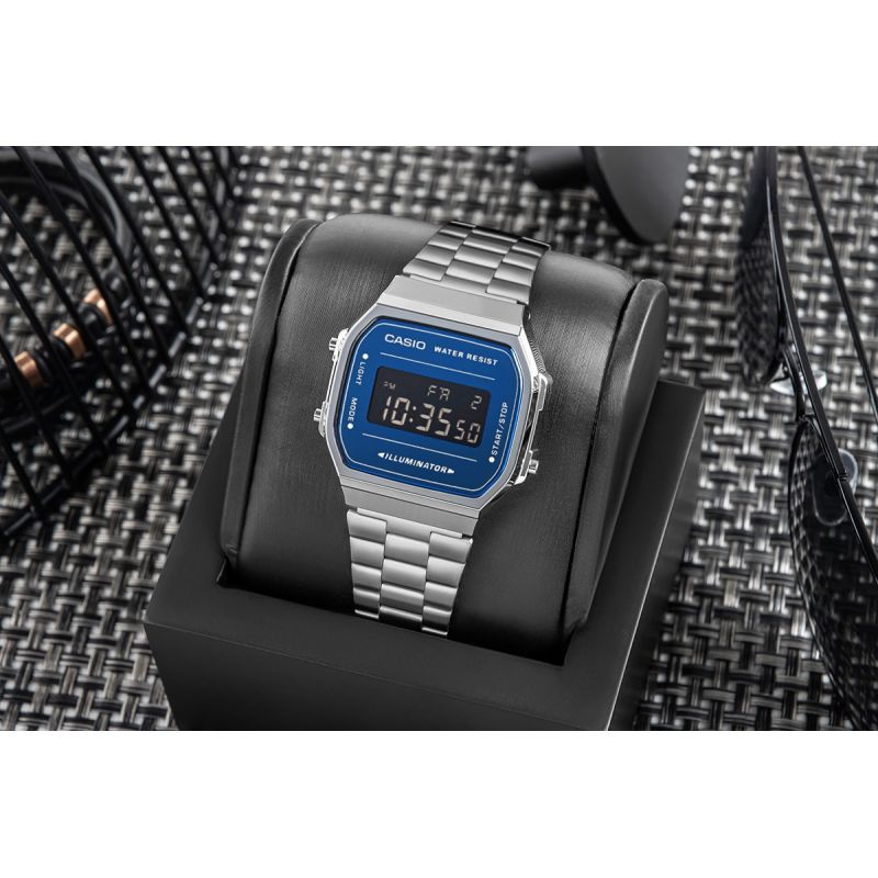 Sie brauchen keine auffälligen Accessoires, um Aufmerksamkeit zu erregen. Die klassische Casio-Silhouette trifft hier auf ein modernes Design: Das verspiegelte Zifferblatt in Metallic-Marineblau zieht die Blicke auf sich und reflektiert das Licht mit einem unverwechselbaren Glanz, der in jeder Situation beeindruckt – vom Büro bis zum Ausgehen. Dieses Modell bietet die Standard-Digitalanzeige: Stunde, Minute, Sekunde, Uhrzeit (PM), Datum und Wochentag. Und wenn es darauf ankommt, hat es alles, was Sie brauchen. Eine 1/100-Sekunden-Stoppuhr , eine Zwischenzeitfunktion, ein Tagesalarm und ein Stundensignal – praktische Funktionen in einem eleganten Design. Am Abend, wenn das Licht schwindet, genügt ein einziger Druck – die elektrolumineszierende blaugrüne Hintergrundbeleuchtung erhellt das Zifferblatt und verleiht ihm ein einzigartiges Ambiente. Dieses Modell ist außerdem spritzwassergeschützt – denn das Leben fragt nicht, ob Sie einen Regenschirm dabei haben.